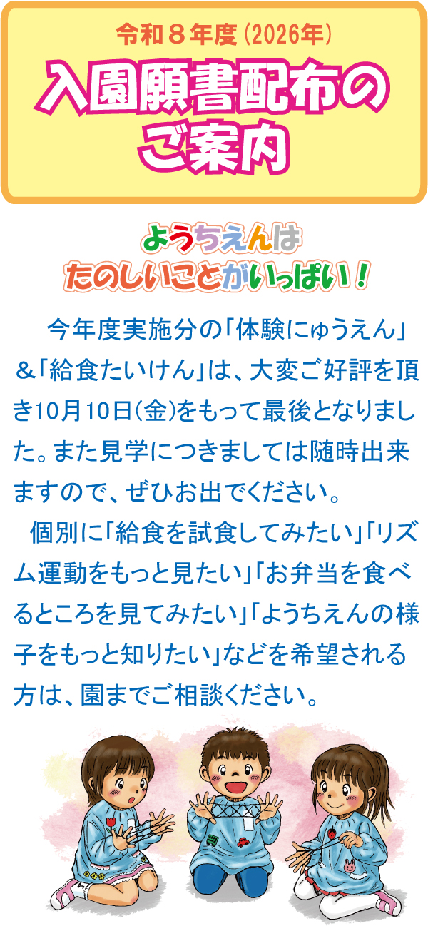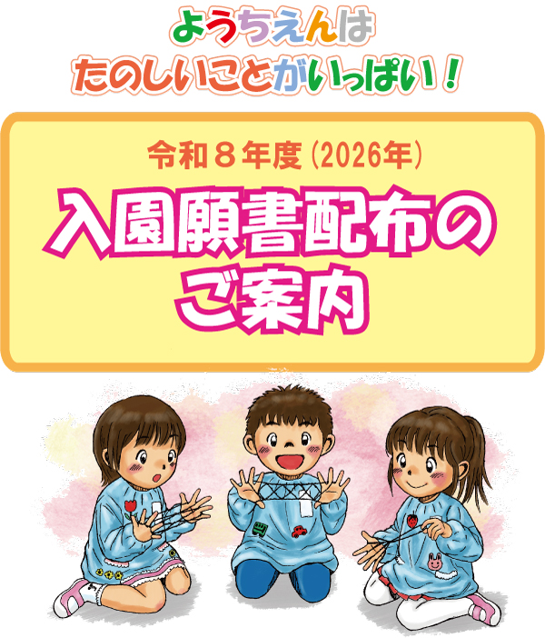 令和8年度(2026年)の園児募集を行います。願書配布は10月15日(水)よりお渡し致します。受付は10月31日(金)朝8時30分よりです。詳細は下記の「入園のご案内」をご参照ください。