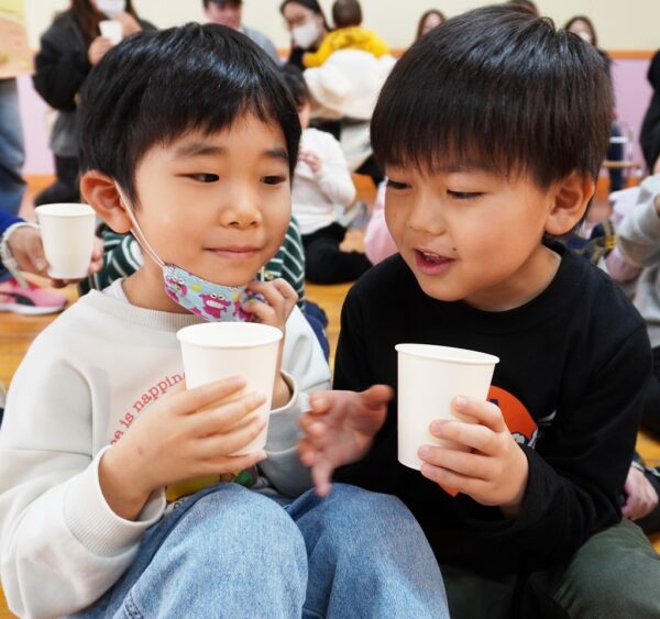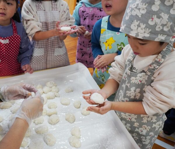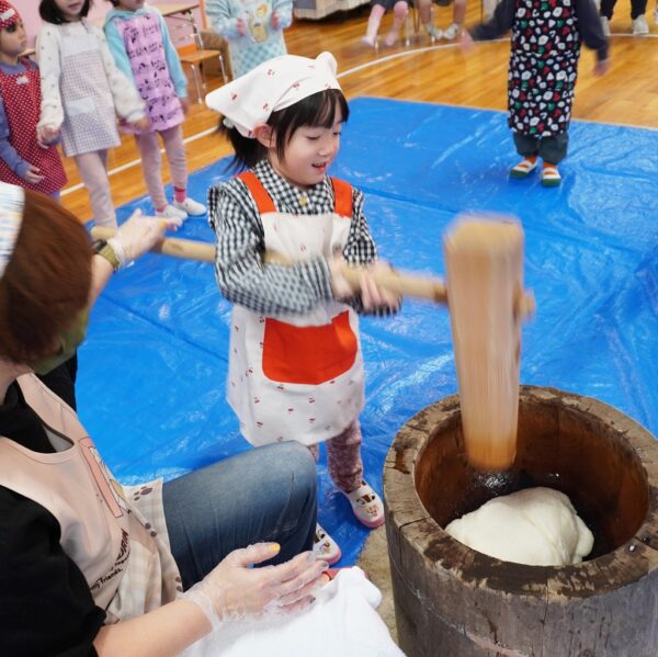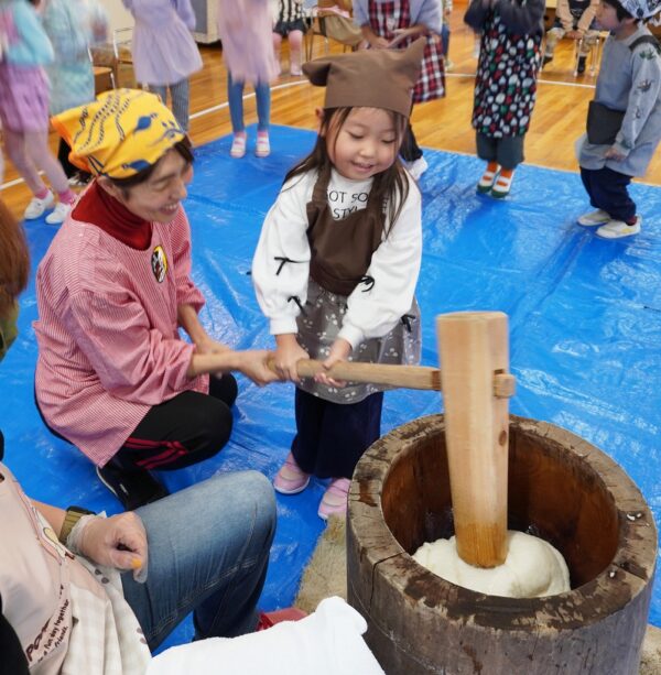 ぺったんぺったんおもちつき♪ みんなが楽しみにまっていた年末の風物詩『おもちつき』が開催されました!昔ながらの臼と杵を使い蒸かしたてのモチ米をみんなで力を合わせて突きました!仕上がったお餅はアン餅やきな粉餅にして美味しく頂きましたよ♪